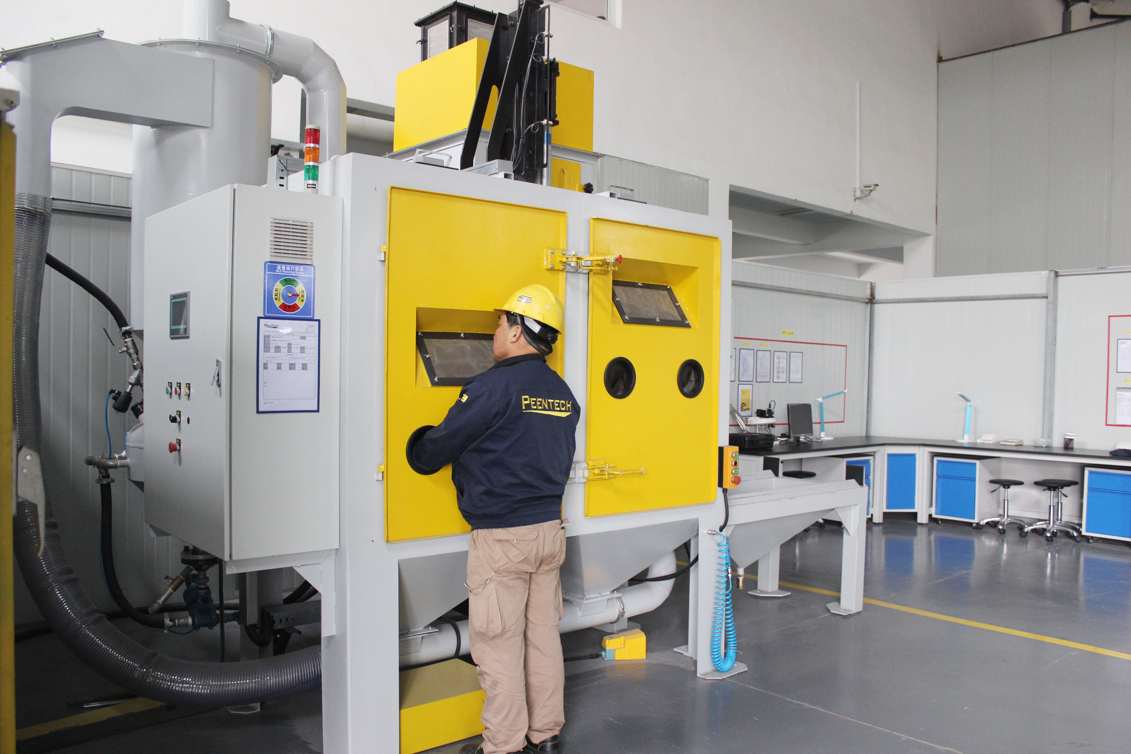 • 特點:采用一體化設計,占地面積小,無地坑。配自動進出臺車,臺車可自動進出噴丸工作室,并進入噴丸狀態時,轉臺可自動旋轉 零件進出采用氣缸門密封結構,自動化程度高,噪音低且密封性能好。工作位可以當檢修門打開,提高零件裝卸的方便程度。